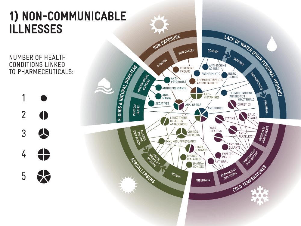 This data is all relational rather than numeric, but it's quite complex in its own way. The left column shows diseases, the second is a series of climatic conditions that will lead to increasing prevalence of these diseases. The third column is the medications used to treat these illnesses, and the fourth gives some examples of the drug names these are marketed under. The challenge was to try and give an overview of which pharmaceutical products would be used more often because of climate change. Many are used to treat multiple conditions, and climatic changes often lead to multiple changes in disease prevalence.