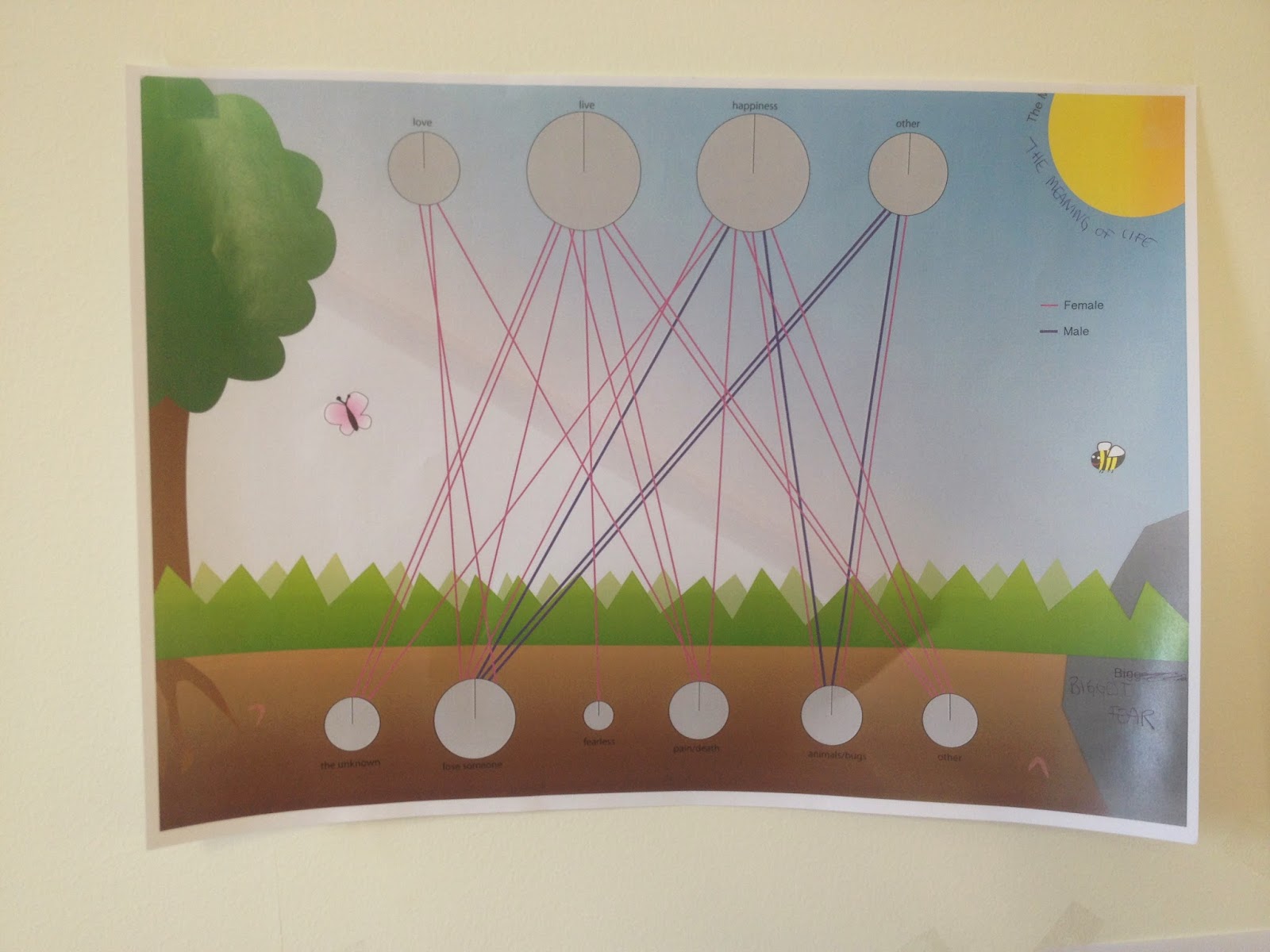 This group decided to combine elements of their different sketches together, to represent people's hopes (in the sky) and fears (buried underground). They also didn't get time to finish - they wanted to design symbols to represent the hopes and fears to go on the circles. I'm always cautious about using circle area to represent data as it's a bit harder to interpret than bar heights. However, in this case I think it works, since they do allow the anchoring of the link lines better than a bar would. If they'd had more time, I'm sure they would have been able to put the titles on properly (they need to be a bit bigger). Good to see the key for male / female, but some kind of key for the circle size would probably be helpful too.